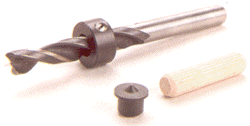 Una vez ajustados los tableros y colocadas firmemente las mordazas pasaremos al taladrado. Debemos centrar bien la broca a la mitad del grueso del tablero y taladrar lo más perpendicularmente posible hasta que la broca-fresa empiece a avellanar la superficie. El avellanado sirve para que la cabeza del tornillo quede al ras del tablero. El número de taladros debe ser proporcional al largo del ensamble y a la carga que vaya a soportar. Por ejemplo, para la unión de una balda a un lateral de una estantería de hasta 30 cm de fondo, bastará con dos taladros. Por último meteremos los tornillos en sus agujeros, los apretaremos con la llave allen y soltaremos las mordazas, pasando al siguiente ensamble.