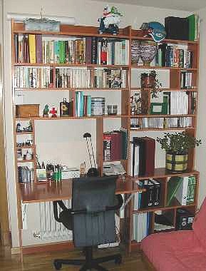 RESULTADO Simplemente sabiendo cantear y ensamblar tableros de la forma descrita en nuestros consejos, podrá hacerse infinidad de muebles a medida, totalmente adaptados a sus necesidades y a un precio incomparable. Como muestra, la siguiente foto cedida por nuestro cliente y amigo José Manuel, que fabricó una estantería totalmente a medida (en aglomerado plastificado en cerezo de 19mm, canteada con bizcocho y con ensambles de espiga), con una práctica mesa de estudio abatible que al cerrarla oculta el radiador.